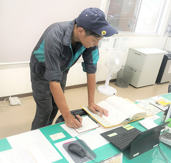 徳島営業所でサービス業務を担当しており、機械の修理、整備、点検業務が中心になります。場内での業務と、お客様を訪問して行う出張業務の割合はおおよそ4:6という感じで、入社後半年程は先輩社員に同行しマンツーマンで基礎知識・技術を育成してもらいその後一人で現場修理などを行うようになりました。